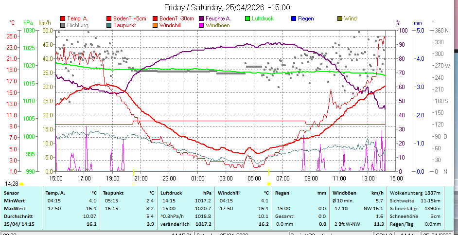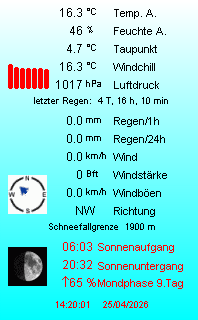 +++ Aktuelle Werte ( 12:50 Uhr ): Temperatur: 14.0 Grad C , Luftfeuchte|Taupunkt: 57 %|5.6 Grad C , Luftdruck (Trend 3h): 1017.9 hPa ( -0.4 ) , Wind: 0.1 km/h ( aus NW ), Windböe: 3.2 km/h , Windspitze heute: 1.0 km/h , Niederschlag 1h|24h: 0.0 |0.0 mm +++